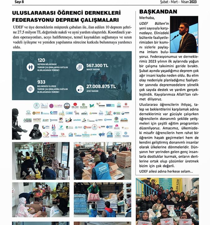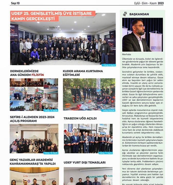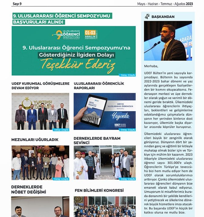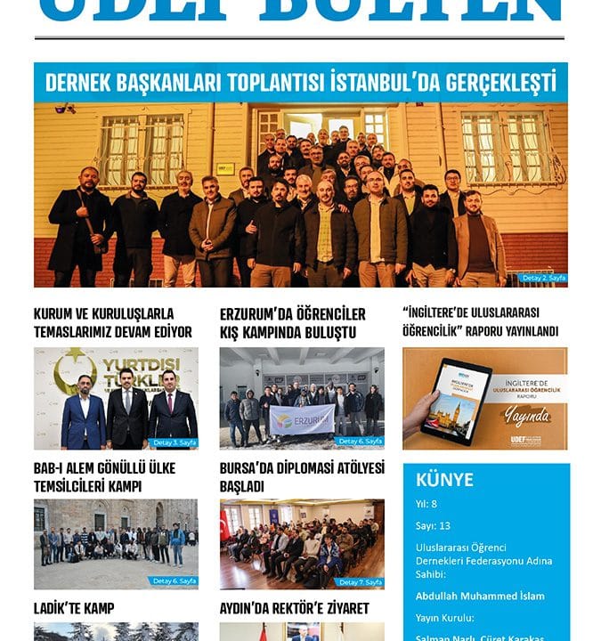 - UDEF Bülten 13. Sayı Uluslararası Öğrenci Dernekleri Federasyonu (UDEF), son zamanlarda gerçekleştirdiği etkinlikler ve yayınladığı raporlarla dikkat çekiyor. İşte son dönemdeki başlıca gelişmeler: İstanbul’da düzenlenen Dernek […]